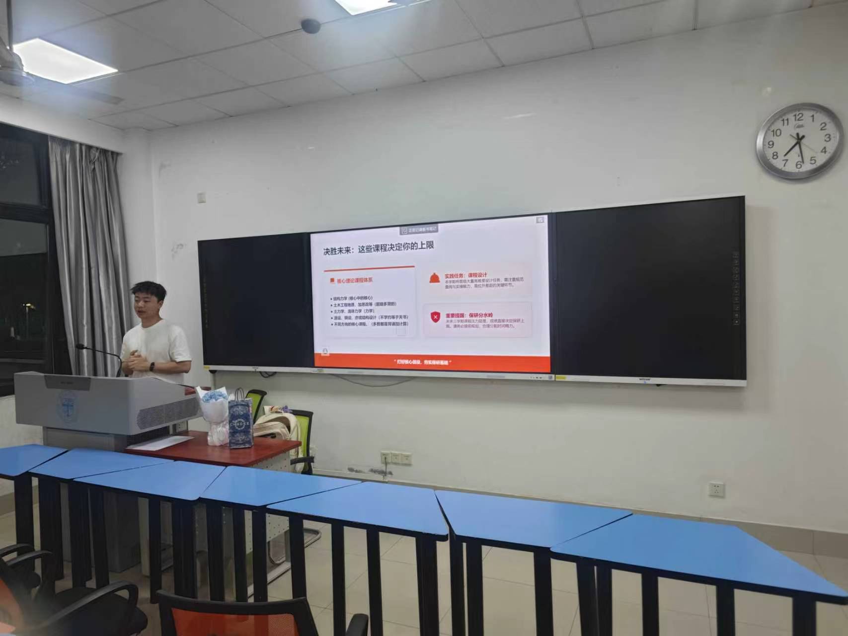 活动开始,李陽对土木工程专业不同发展方向作了系统对比分析。他依托往届专业综合排名数据,解读推免要求,围绕专业课学习、竞赛选择、科研筹备三大核心难点给出针对性建议。李陽提到,结构力学等核心课程是拉开成绩差距关键,课程设计是推免重要分水岭,需重点突破。竞赛上,他建议同学们可以考虑选择人工智能、算法类等方向。在科研环节,李阳结合身边同学推免的真实案例,强调科研是推免的核心竞争力。真正有竞争力的科研经历需兼顾“经历+成果”,建议同学们抓住大二SRTP申报机会,主动开展个性化实验,力争产出论文、专利等硬核成果。