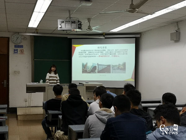 接着,班长荆祥同学宣布此次“学术报告交流会”活动正式开始,活动以分组的形式展开,共有5位同学代表小组进行了PPT报告分享。周荣建同学以《关于非饱和土抗剪强度的讨论》为题展开交流,为大家讲解了当前非饱和土抗剪强度公式的特点;韩莹同学为大家分享了《砂土级配特性对其渗透性影响的实验研究》的报告,主要说明了研究砂土本身的级配特性用来解决渗流现象;万安林同学对于卸载深度变化时同一点抗剪强度变化规律问题,做了《卸载对土的抗剪强度影响》的汇报;余健同学以超大直径海底盾构隧道的角度,为大家带来了题为《高烈度地震区、软硬不均地层超大直径海底盾构隧道关键技术》的分享;苏磊同学以《陡坡桥梁基础受力及变形室内试验研究》为题进行了陡坡桥梁基础在受到荷载作用时的变形情况及相应室内试验的汇报。