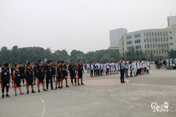 中午十一点五十,决赛开幕式正式开始。在队员和观众热烈的掌声中,世茂集团钟明先生率先发言。钟先生首先赞扬了我校学生积极向上、热情阳光的精神面貌以及运动员们的团队和拼搏精神,之后向我校有志于进入世茂集团的优秀毕业生发出邀请,期待他们加入世茂集团。随后,土木工程学院团委副书记石莹讲话。石莹老师首先向给予本次联赛大力支持的世茂集团和各兄弟学院表示衷心地感谢,并表示希望通过此次篮球联赛进一步加强各兄弟学院之间的联系,加深每个新建班级大家庭中同学之间的友情。仪式最后进行了裁判员代表和运动员代表宣誓。两位同学均表态,将严格遵守比赛规则,公平、公正判罚比赛,团结、友谊打好比赛。