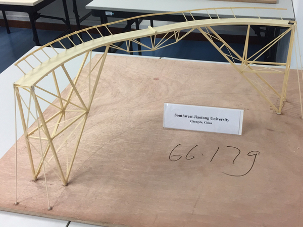 我校设计的桥梁以66.17 g的总质量实现最轻量,其他14所高校设计的桥梁的平均质量为213.62 g。最终,我校设计的桥梁顺利通过了静载实验;但是,在动载测试时,铁球停在了离桥梁末端约3 cm的位置,从而未能获得动载得分。
