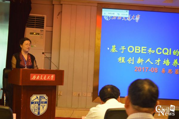 西南交通大学易思蓉教授做了以“基于OBE理念的铁道工程培养方案解析”为题的报告。对OBE-CQI工程教育意义进行说明,讲述了基于OBE工程教育改革从关注学生学了什么转变为学生学会了什么,将学生放在首位,围绕学生设计培养,注重课堂管理;并强调师资队伍要持续培训。
