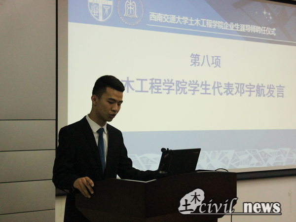 最后,土木工程学院学生代表邓宇航进行发言。他说,希望从导师身上了解更多行业背景、增加人生阅历,使土木学子有更多的提升。邓同学一番激昂的演讲不仅表达了自己对学业以及未来的决心,也表明了土木学子对未来的期许。