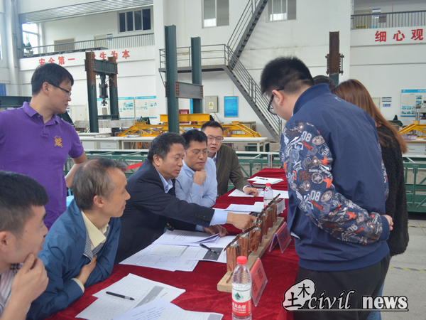 上午8:30,第一组选手开始加载,本次比赛方式为选手答辩与模型加载同时进行,现场评委根据模型与计算书提问。G0001组三位大一选手进入加载区,很遗憾他们加载失败。观摩完选手的计算书以及PPT后,丘延俊等几位老师向选手介绍了部分道路的专业知识,几位评委对计算书中不合理的部分与选手进行交流,并鼓励他们总结经验,明年再战。G0004组答辩选手从联系现实,部分分析,整体效能,制作过程四个方面介绍了PPT,他们通过刚柔结合,将刚性为主结构变形为柔性为主结构,吸收应变能,令人眼前一亮。G0004组的选手实事求是,敢于创新,最终加载成功,赢得了评委和其它选手的掌声。