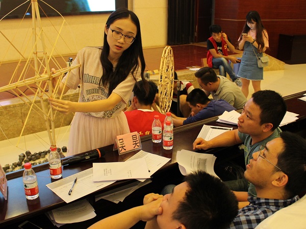 5月20日上午8点半,桥梁承重和桥梁造型比赛正式开始,栗怀广、张锐、邓开来等老师作为评委出席。