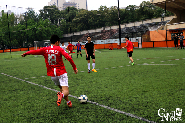 专硕隧道和博士队整场比赛打得十分火热,双方的攻势此起彼伏。上半场刚开场不久,博士队员张川就趁专硕隧道立足未稳先进一球。随后博士班攻势有增无减。但桥梁这边毫不示弱,凭借积极地拼抢,创造了几脚很有威胁的射门,只可惜都没有转化成得分。下半场,专硕隧道重新调整了战略队形,调整心态进行反攻。博士班在场上争先恐后,来回传球,队员张川帽子戏法又进两球。场上形势越来越胶着,时时发起高潮,场边的观众也渐渐的多了起来,大家连连欢呼叫好,紧张的气氛一直环绕在球场上方。随着比赛的深入,专硕隧道球员体力下降明显,博士班抓住机会,把比分进一步扩大,终场时,比分定格在7:1,博士班顺利晋级总决赛。