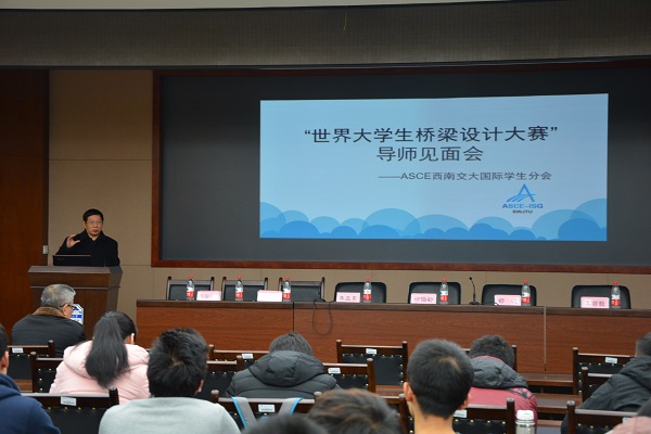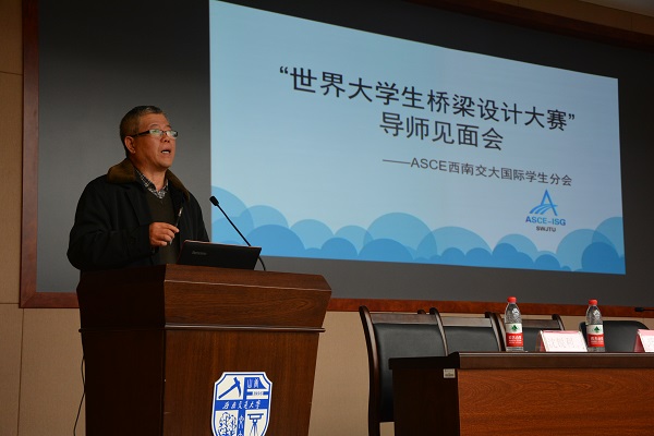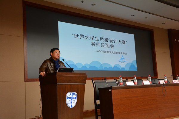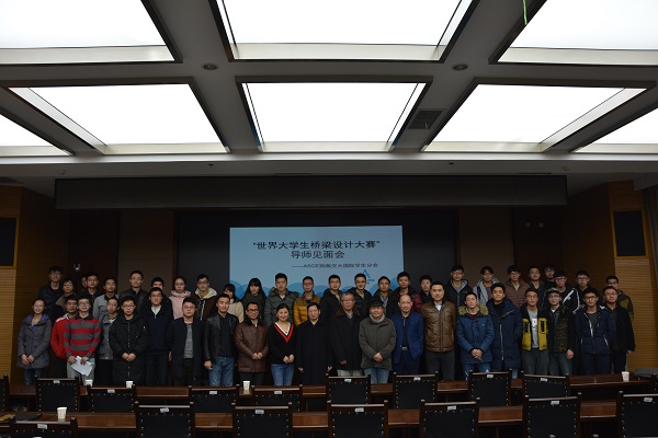 2017年1月10日9:00,由西南交通大学土木工程学院桥梁工程系、美国土木工程师学院西南交通大学国际学生分会(ASCEISG-SWJTU)主办的世界大学生桥梁设计大赛西南交通大学导师见面会于犀浦校区综合楼148第七会议室顺利举行,来自土木工程学院的郑凯峰、李亚东、沈锐利、栗怀广老师,建筑与设计学院的徐伯初、舒波、李百毅、黄媛老师分别为与会的本科生、研究生进行分享与交流。
