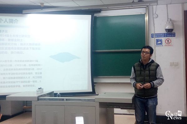 2016年11月4日下午15:50,由我院研究生会学术部承办的“土木大讲堂之师兄师姐面对面”首场分享会在九里校区4304A举行。本次分享会的主讲人为2014级土木博士研究生遆子龙。