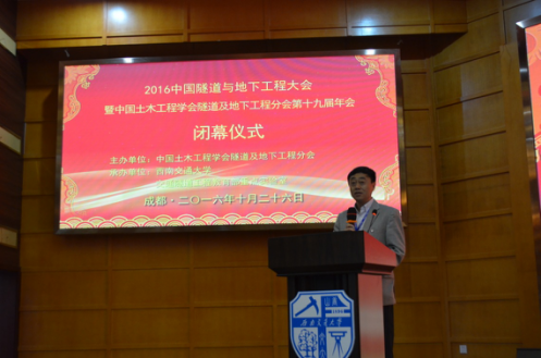 2016年10月26日下午16:00,2016中国隧道与地下工程大会暨中国土木工程学会隧道及地下工程分会第十九届年会闭幕式在西南交通大学网络学院国际会厅隆重举行。闭幕式由隧道系仇文革教授主持,大会名誉教授轩辕啸雯、分会秘书长洪开荣、大会副理事长何川教授、隧道系主任王明年,以及张志强等专家领导出席了该闭幕式。本次隧道年会与会的专家代表达到了1261人,其中两院院士12位、国际隧道现任及前任领导5位、成都市领导1位、国外代表4位,参会人员规模为历届最大,另外,本次大会首次开创了国际隧道与“石门论道”两个特色专场,可谓大会的一次革新。