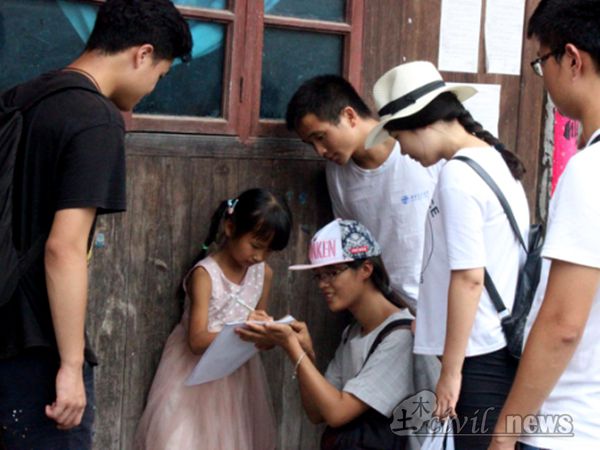 第二支队接着又走访了几户。中间遇到一个羞涩的姑娘,她叫张双凤,她还有个弟弟。双凤的奶奶特别和蔼,和志愿者们一起聊了小双凤的一些情况。双凤小朋友家里情况不乐观,爸爸遭遇车祸,妈妈改嫁,至今已有几年未归。可能正是因为这样,面对志愿者们,她的羞涩更像是自闭症,志愿者们只能主动找话题。开始的时候她只会被动机械地回答“嗯”,可后来聊到动画片和玩游戏,她开始愿意和志愿者们交流。在交流中,志愿者们发现她是乖孩子,成绩优异,只是不太爱说话。第二支队的成员们只能短暂停留,但是他们愿意用那颗真心去感化孩子们。