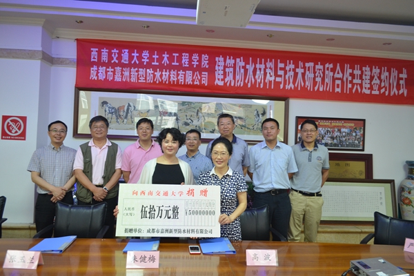 6月2日上午9点,西南交通大学土木工程学院与成都市嘉洲新型防水材料有限公司的合作签约仪式在西南交通大学土木馆1208会议室举行。在签约仪式上,土木工程学院高波院长与成都市嘉洲新型防水材料有限公司张玉兰董事长共同签约了“建筑防水材料与技术研究所合作共建框架协议”,标志着双方在建筑防水材料研究领域上的长期合作。