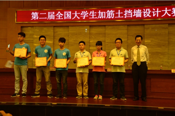 土挡墙设计大赛一等奖获奖选手接受颁奖(左起4到6为西南交大选手)
