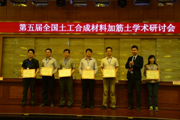 唐晓武教授高度赞扬了此次研讨会和大学生加筋土挡墙比赛,阐述了这两项活动在岩土工程领域的重要意义。随后,上海勘察设计院白建颖高工宣读了本次加筋土研讨会优秀论文名单,共27篇。其中包括三篇来自西南交通大学的论文。7位优秀论文第一作者作为代表上台接受表彰。