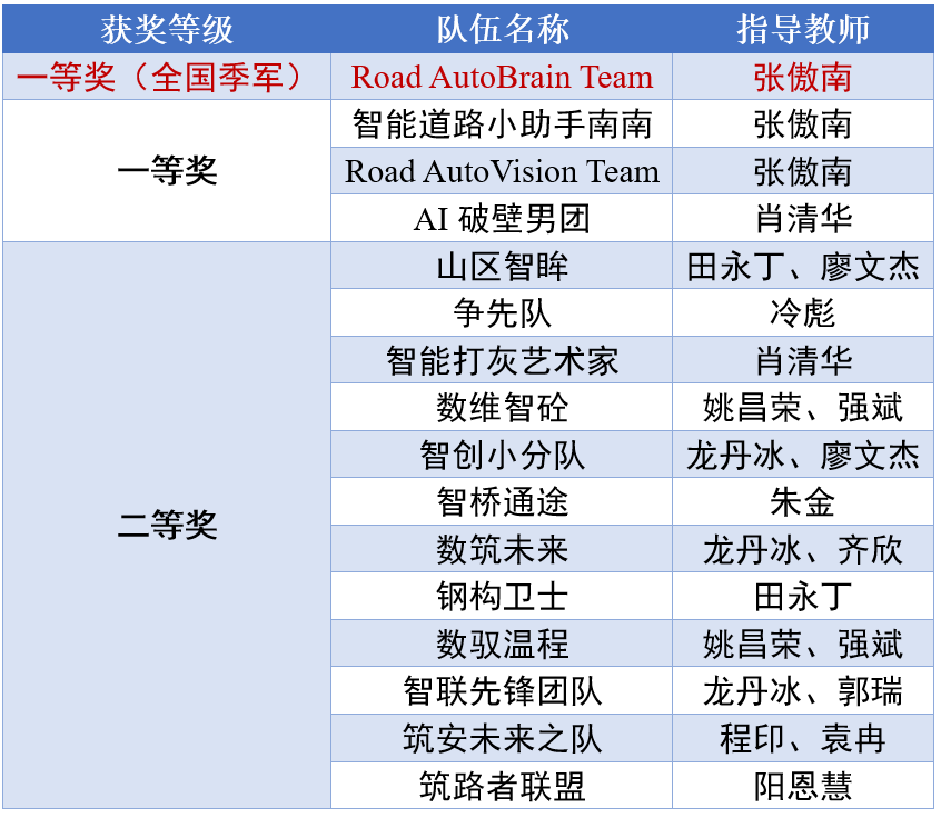 作为大赛的重要参与者,我院团队凭借扎实的科研功底与创新实践能力,在众多优秀队伍的角逐中突破重围,斩获佳绩。其中,由张傲南教授指导的Road AutoBrain Team团队一路过关斩将,成功斩获全国季军(一等奖),成为我院在此次赛事中的亮眼名片;同时,4项一等奖的荣誉还包括张傲南教授指导的“智能道路小助手南南”“Road AutoVision Team”两支队伍,以及肖清华教授指导的“AI破壁男团”。此外,田永丁等14位老师指导的12个团队进阶决赛后均顺利拿下二等奖,尽显我院学子的创新风采与团队协作能力。