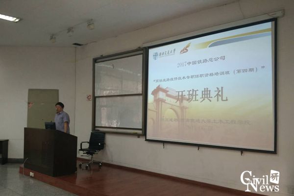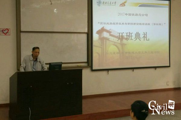 6月16日上午8点半,由西南交通大学土木工程学院和中国铁路总公司联合举办的2017中国铁路总公司“高铁线路维修技术专职任职资格培训班(第四期)”开班典礼在九里校区0222教室举行。土木工程学院任宝良副教授、土木工程学院继续教育中心江富长书记、郭静老师以及各个铁路局学员出席了此次开班典礼。此次培训班的学员主要由来自各铁路局及铁路集团的领导和高铁线路骨干人员组成,培训的目的是针对当前高铁工程一线生产作业状态,与学员一起学习研讨相应实际问题,提高学员的适应性能力,为以后的高铁生产作业提供理论和技术的双向支持。