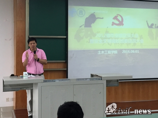 6月1日下午2点30分整,在X4359教室顺利举行了2012级毕业班党员大会暨安全文明离校班委动员大会。出席本次大会的领导和老师有土木工程学院党委李锦红副书记,12级辅导员付真珍老师、黄雪娇老师、杨森老师,15级辅导员熊麟老师,本次大会主要对12级各班班委以及各位毕业生党员进行了文明离校的动员。