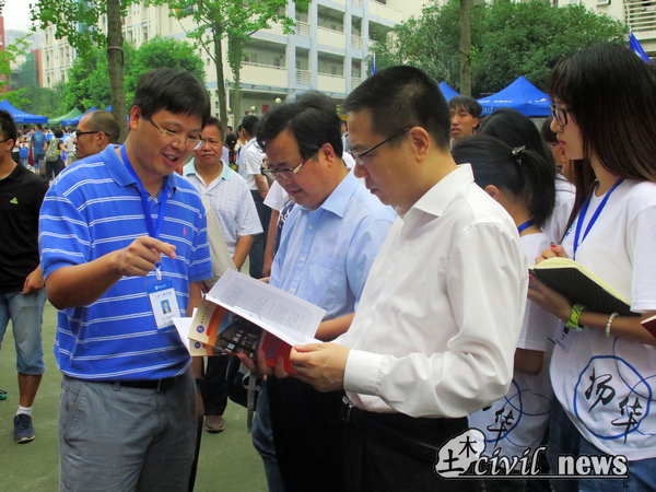 王顺洪书记和徐飞校长对土木学院的“新生大礼包”十分感兴趣,还拿起了一本《2015级土木新生导航》,饶有兴致的阅读了起来。《2015