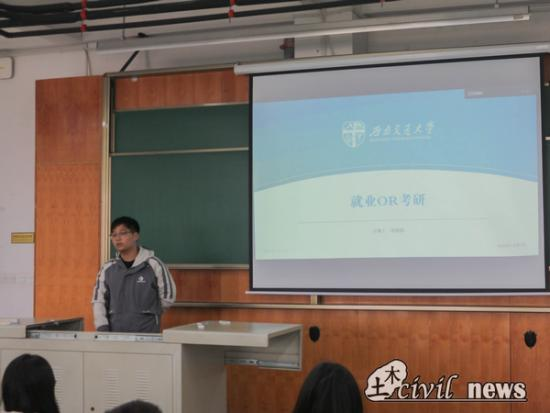 针对大部分学生对于考研后心态调整方法及对就业的疑虑,在本次考研就业指导会中土木工程学院邀请到了研一的项晨阳同学、研二的汤旭同学、研三的刘心然同学、已经参加工作的蒲红同学以及考研成功“上岸”的徐展飞同学展开分享。同学们通过讲述自身经历,以交流问答的形式向大家分享了不同阶段的学习方法及心态调整的相关经验,有针对性地为毕业年级的学生提供就业或升学指导。