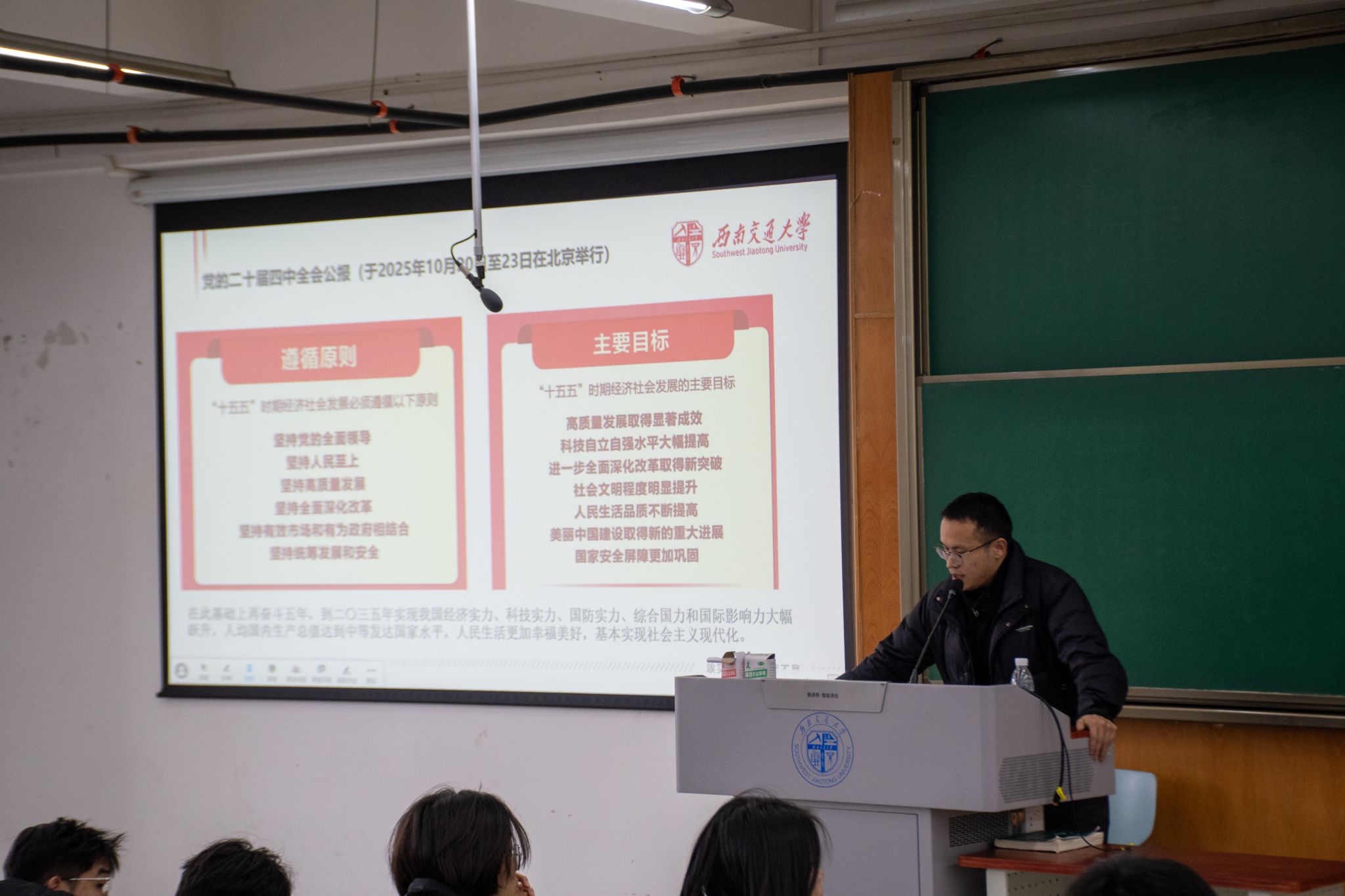 11月27日下午15:45,“党的二十大精神、习近平新时代中国特色社会主义思想学习及爱国荣校”专题教育学习,在X4359教室进行。彭政涛老师系统解读了党的二十大精神核心要义和实践要求,深入浅出地帮助学生厘清理论脉络、把握思想精髓。彭老师指出,作为新时代的大学生,大家要深刻领会党的二十大精神,将个人成长与国家发展紧密结合,为实现中华民族伟大复兴的中国梦贡献自己的力量。最后,彭老师对同学们提出殷切期望,希望大家能够珍惜这次培训机会,认真学习、积极思考、勇于实践,努力成为新时代的优秀学生干部。
