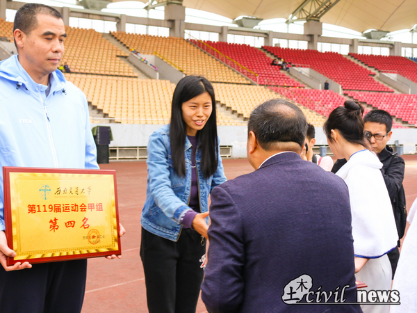 首先,由总裁判长李宏图宣布运动会的比赛成绩,土木学院以258分位列甲组第四名,以16分位列甲组学生体质四项团体总分第四名,由沈火明教授为同学们颁奖。接下来,由校工会主席阎开印教授宣布教工比赛成绩,土木学院以136分获得教工甲组第六名,由阎开印教授颁奖。