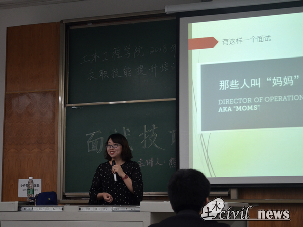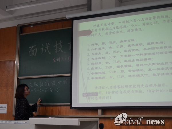 4月23日晚18点五十分,由土木工程学院就业指导中心举办的土木工程学院2018年度求职技能提升培训在X4152准时展开,2015级辅导员熊麟就面试技巧给同学们上了生动而充实的一课。