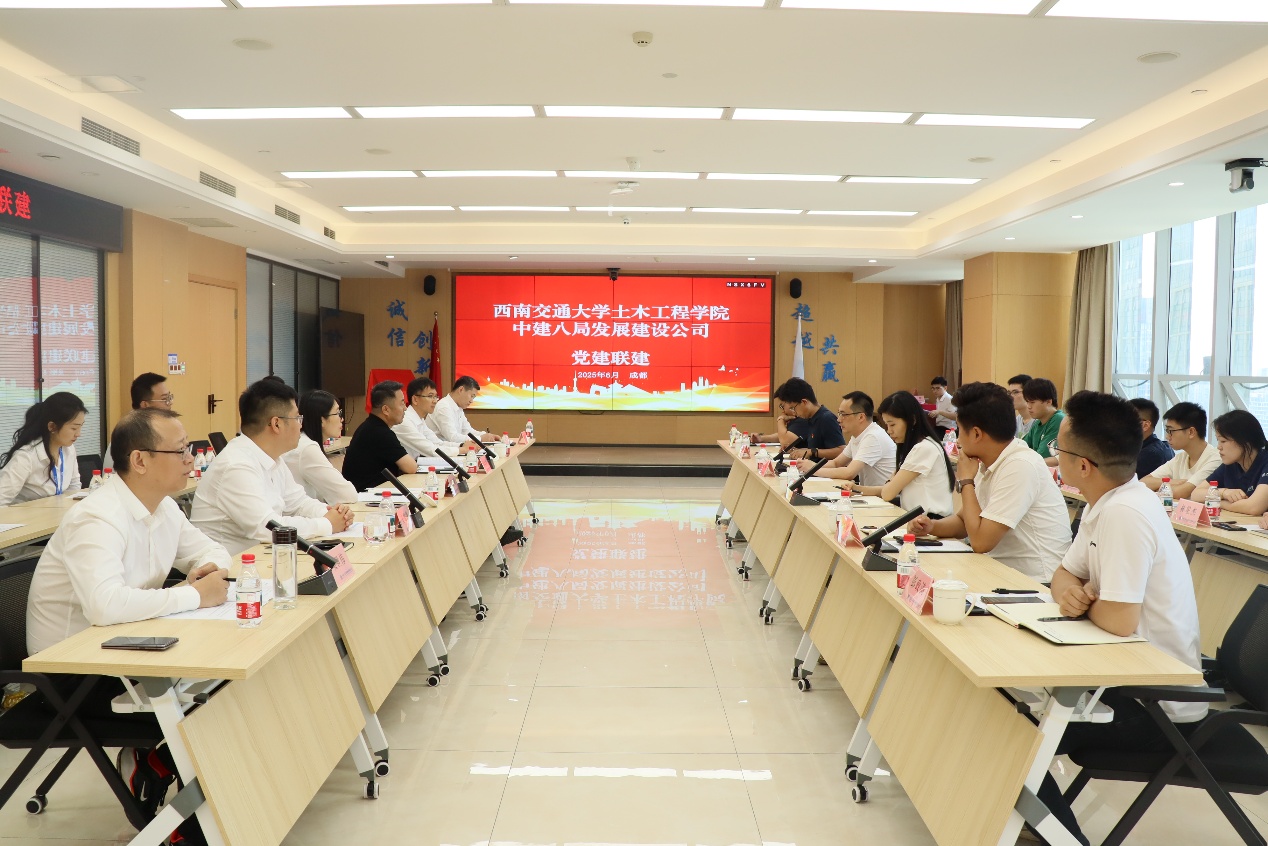 2025年6月30日,在庆祝中国共产党成立104周年之际,西南交通大学土木工程学院与中建八局发展建设公司在成都隆重举行“结对共建,聚力育人”党建联建暨校企交流活动。中建八局发展建设公司党委副书记、工会主席陈成林,中建八局发展建设公司人力资源部经理张恩利,中建八局发展建设公司西南分公司党总支书记、总经理王思臻,中建八局发展建设公司西南分公司党总支副书记、工会主席吴世伟,西南交通大学招生就业处副处长周曦,西南交通大学土木工程学院党委副书记刘萍,辅导员代表出席活动,本次活动由中建八局发展建设公司党建工作部(企业文化部)主任、工会工作部部长吴春涛主持。
