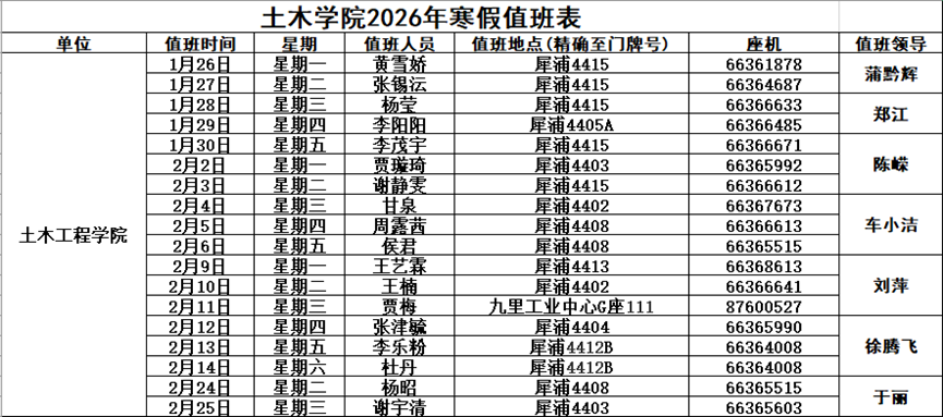 岁末将至,敬颂冬绥,紧张而充实的校园学习生活暂告一段落,2026年寒假即将来临,为保障全体师生能畅享一个安稳、康泰、欢愉的假期,筑牢校园的安全防线,扎实推进学院安全管理事务,土木工程学院特送上温馨提示:无论您是踏上归乡之旅,还是留校度过假期,亦或是参与各类实践活动,请时刻牢记 “安全第一”, 同时全院师生也要做好寒假期间各类隐患的排查、预防等工作,为假期安全保驾护航。