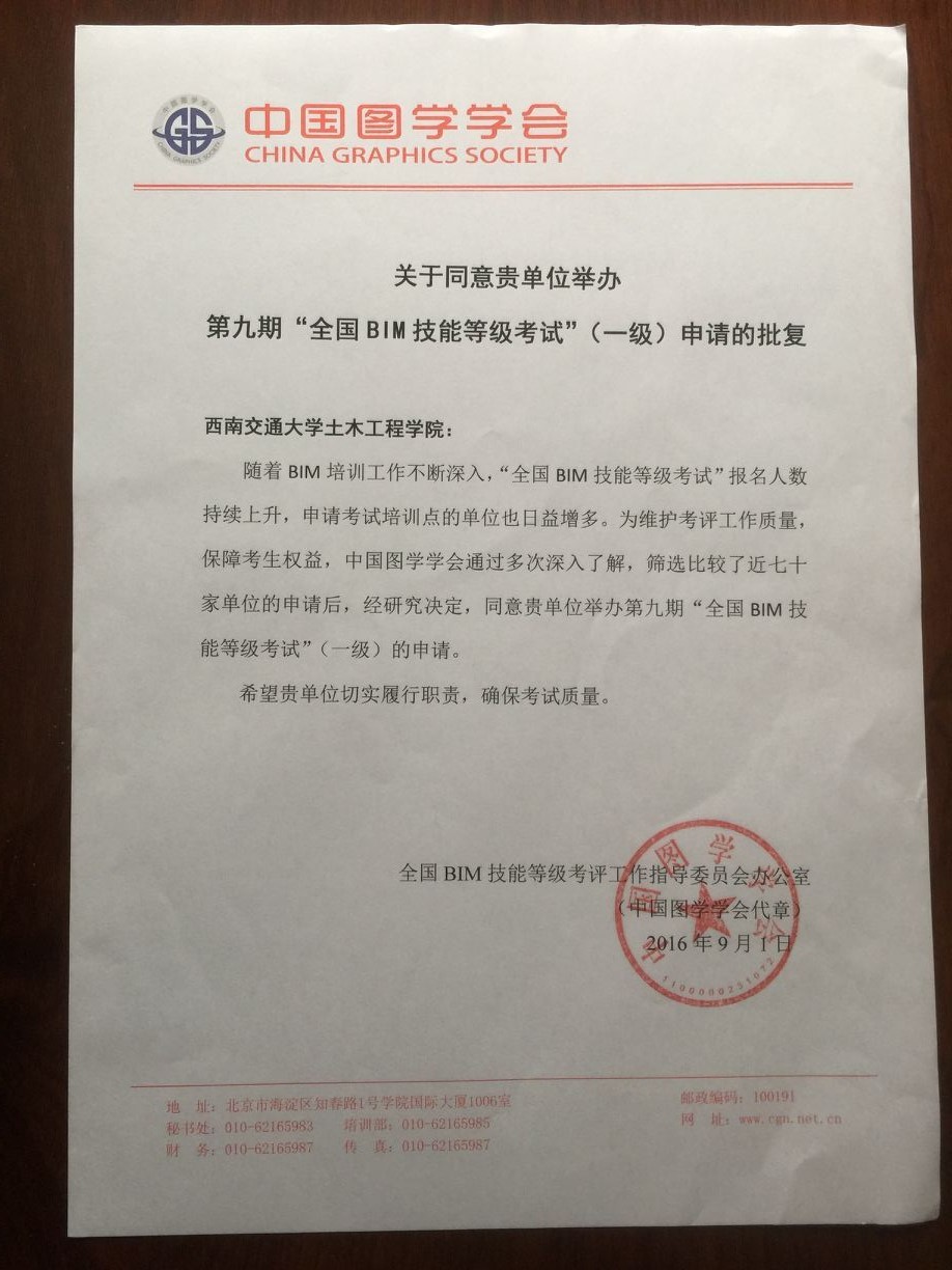 中国图学学会通过多次深入了解与研究,决定将西南交通大学土木工程学院列为第九期“全国BIM技能等级考试”(一级)的考点。