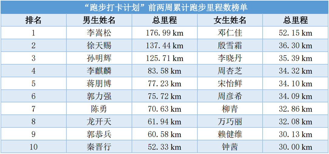 跑步打卡计划开展两周以来男、女生累计跑步总里程前十名的选手名单及跑步里程数公布如下: