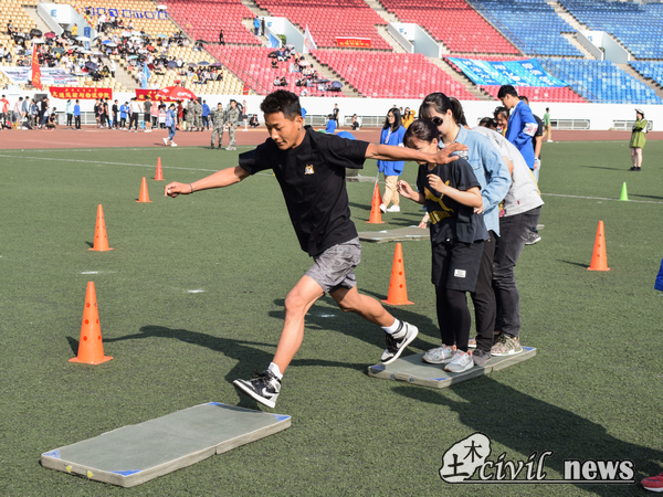 于此同时,径赛部分,学生甲组同舟共济的比赛,体现了学生之间的团结和合作能力,他们认真专注,小心翼翼而又行动敏捷,互帮互助完成比赛。最后,土木工程学院的四名选手以1分23秒零失误的好成绩夺取此项目的第一名!