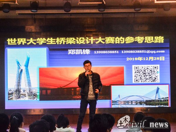郑教授首先为大家解读了由中国公路学会中交公路规划设计院有限公司下发的《关于开展“中交公规院杯”2019世界大学生桥梁设计大赛的通知》文件,和分析了在桥梁设计的哪些方面做文章最容易获奖,并鼓励大家设计以“大”为主的桥。他表示这是一个考验能力和眼界的竞赛,敢于创新是关键,越是大家想不到的桥越容易获奖。随后郑教授着重强调了效果图的重要性,他指出,效果图的好坏占到了成败因素的80%,他还明确表示在今天宣讲中他会三次提到要做好效果图。