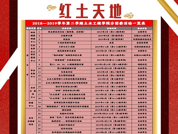 【红土天地】土木工程学院分团委2018-2019学年第二学期活动一览表
