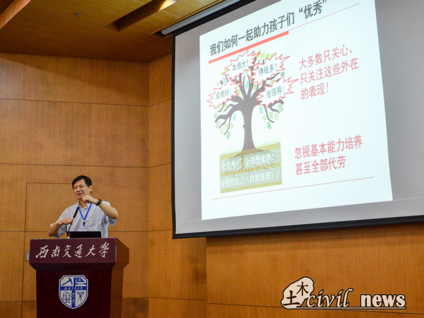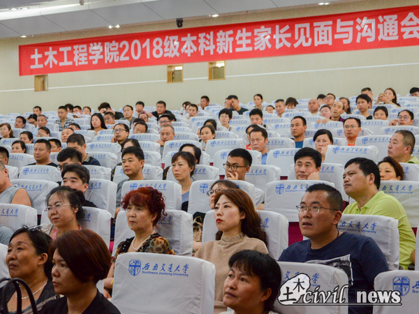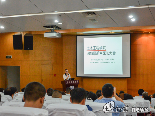 在向新生家长们介绍交大概况时,李锦红副书记用“中国铁路工程师的摇篮”和“东方康奈尔”两个别称,形象直观地向学生家长展示了我校在轨道交通领域的卓越成就与突出地位。随后李书记就科研与教学平台、师资力量、科研成果与人才培养这四个家长最关心的方面对土木工程学院进行了详细讲解,摆数据讲事实,充分展示了我校土木工程学院强劲的办学实力。