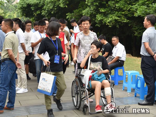 上午的接待工作渐入佳境时,迎新点迎来了一位特殊的同学。由于行动不便,这位新生同学是坐在轮椅上与妈妈一同前来报道的。见到这番情况,党员先锋队的志愿者们迎上前去,热情地上前关切并给予帮助,让新同学与家长倍感温暖。