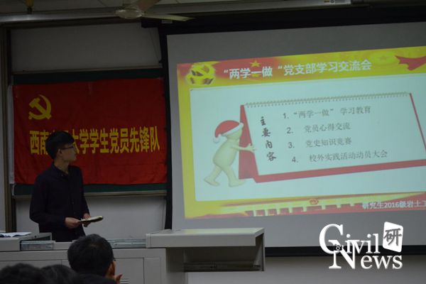 2016年11月3日下午, 土木工程学院2016级岩土一班在逸夫楼4320开展了“两学一做,争做模范先锋”主题的党支部特色活动,全班所有党员和入党积极分子参加活动。