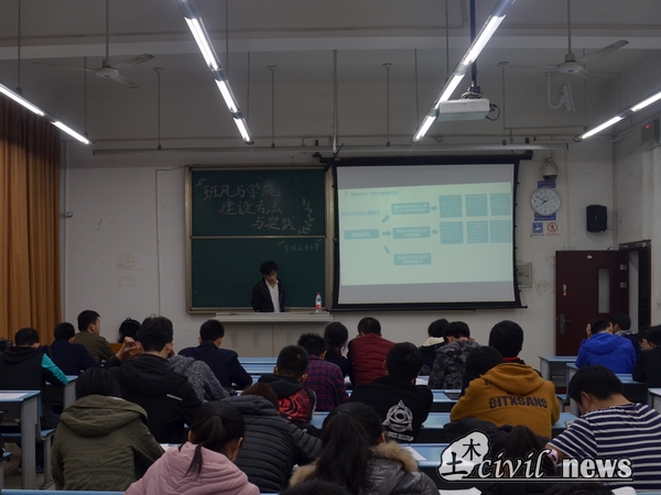 巨老师将班级文化与班级建设相联系,并介绍了土木工程学院对班级建设所进行的举措,如西南交通大学“先进(优秀)班集体”创建活动实施方案、土木风云榜及土木工程学院十大明星班级评选、土木风云榜及土木工程学院十大明星班级评选等。巨老师向同学们展示往届优秀班级的优秀成果。