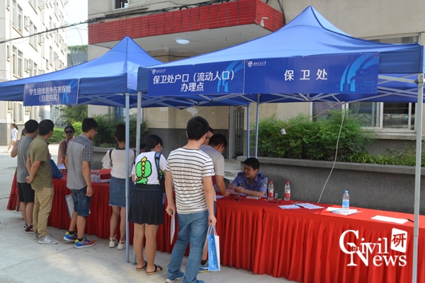 在西南交通大学九里校区,多处安放了报到、缴费、体检等指路牌,学校相关部门和学院在写有显著标识的帐篷里欢迎研究生新同学们,为他们办理入学手续。土木工程学院研究生会志愿者热情服务,从咨询引导,到办理入学手续,再到住宿安排,费用缴纳等环节,尽最大努力为新生提供方便。