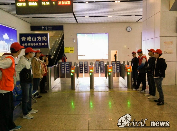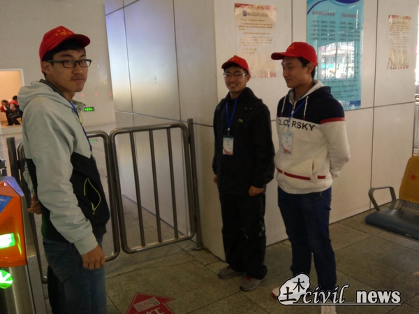 本次志愿者服务的第二部分,则是剩下的人进入高铁站维护进站和出站的秩序。志愿者们刚一进入高铁站,映入眼帘的便是拥挤的旅客。负责维护进站秩序的志愿者便在进站口处,帮助工作人员疏导旅客有序进入站台,主动上前搀扶行动不便的老人并帮助行李多的旅客搬运行李。高铁站的进站口也在土木青协志愿者的帮助下变得秩序井然。而负责维护出站口秩序的志愿者便进入站台,帮助站台的保安疏导旅客有序离开站台或进入犀浦地铁站换乘地铁。当时有部分旅客在检票机前检票时,由于操作不当而无法通过检票口,在我校土木青协志愿者的及时而热心的帮助下,很快通过了检票。此外,在旅客检票时,出站口的部分检票机突然出现故障无法检票,使得部分旅客一时无法出站,土木青协的志愿者便迅速上前向旅客们询问相关情况,在明白问题所在后,就立即向保安汇报,在保安和志愿者们的共同帮助下,旅客们很快便从一个临时的出站口有序离开,高铁站站台的秩序也因此而得到恢复。