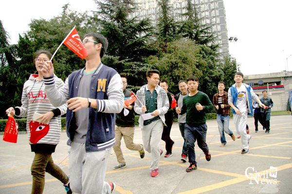 表演结束后,接着是领队带领大家绕着南门雕塑慢跑了两圈,接着领取完首发站点“唐山”便利贴,活动便开始。本次趣味马拉松设置5个站点,其路线是唐山→湖南→贵州→峨眉→成都,选手需到每个站点领取相应的便利条。