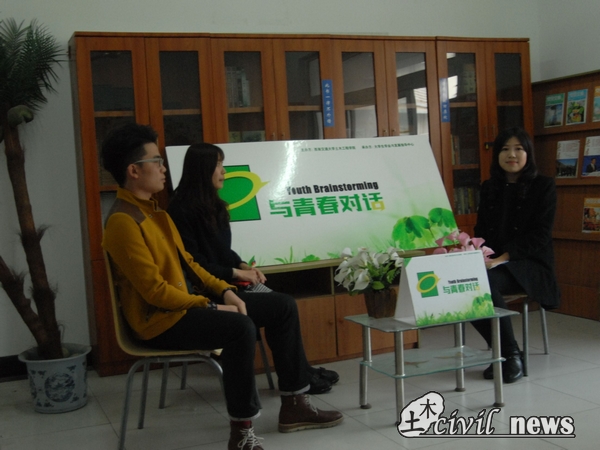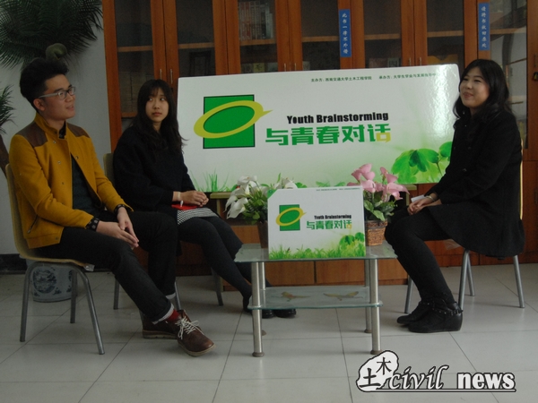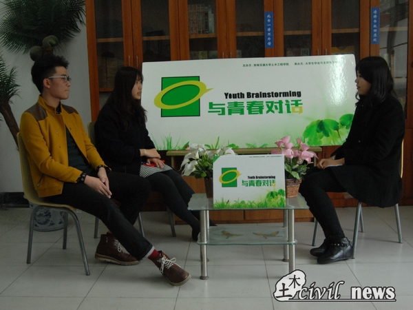 11月6日下午4点,西南交通大学土木工程学院的首档青年思想秀——“与青春对话”访谈节目在天佑斋6号楼的党建室开始了。此节目由土木学院的大学生学业与发展指导中心承办,旨在让优秀的交大学子分享自己独特的大学生活经验与感触。而此次访谈的受邀嘉宾是2012级的杨瑱冉同学和2013级的许晓冬同学,他们因近期在学业上的突飞猛进而备受关注,在下面三十分钟的访谈时间里,主持人孙君将会让两位嘉宾谈谈各自的学习感悟。