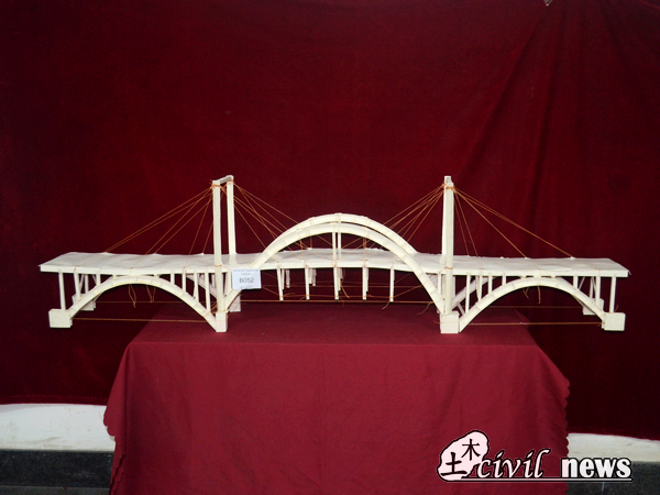 下午1:00,开始预赛模型加载。选手按照组委会所安排本组到场时间准时到达候场教室X4154/X4155,等待候场教室工作人员叫号,叫到本组后,参赛队员拿上本组模型在工作人员引导下进入指定等候区等候,按照工作人员指示,进入加载教室X4153/X4156。一名队员上台进行简单答辩,其余队员将模型拿到加载台上进行安装与加载。小车移动前,加载工作人员会保证四个支座工作状态正常,待挠度测试仪与三个砝码已经挂在模型上后,加载台两头的工作人员开始匀速拉动两辆相向行驶重两公斤的小车,当其到达对面后加载结束,选手确认挠度成绩并签字。从模型的外观到模型承载的能力,参赛作品都大相径庭加载环节是一个重要的得分点。现场加载最好的成绩是0.81毫米,也有的组因为设计不合理导致承载时梁被破坏。加载完成后,选手在工作人员带领将模型送至X4158放置好后,依据本组押金条,工作人员将会退还押金。至晚上6点,89组桥梁模型加载全部完成。