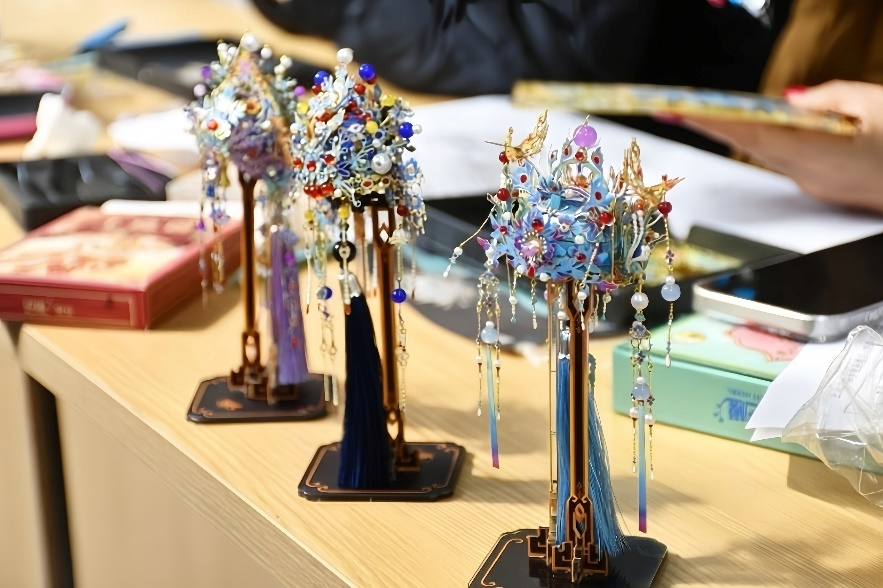 活动伊始,指导老师向大家介绍了凤冠的历史和技艺,作为非遗传统手工艺,凤冠的历史可以追溯到晋代,其精美的制作工艺和华丽的装饰元素都体现了古代工匠们的智慧和才华。活动现场暖意融融、氛围热烈,大家围坐一桌,跟随制作指引认真钻研、剪切零件,扣上卡扣,一件件精致的珠饰被巧妙拼接、固定,原本零散的材料在大家的巧思与协作下,逐渐勾勒出凤冠的精美雏形。制作过程中,大家相互交流技法心得,分享创意巧思,遇到难点时彼此支招、携手解决,欢声笑语萦绕现场。