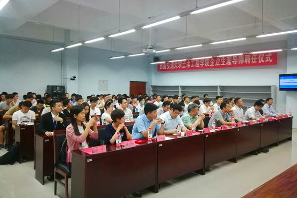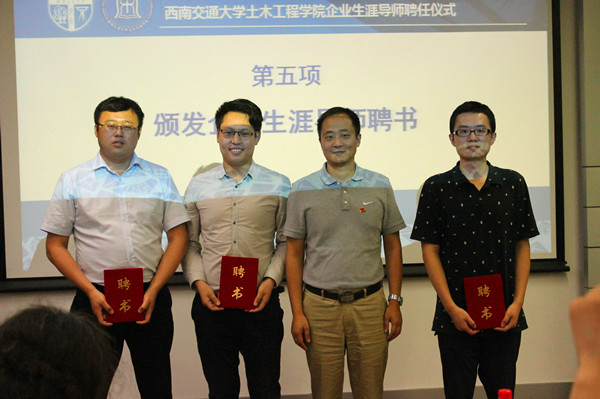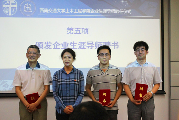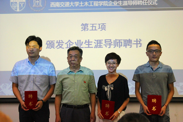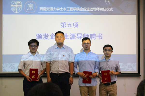 5月25日下午14:30,土木工程学院在X4250教室隆重举行企业生涯导师聘任仪式,出席聘任仪式的领导有学生工作部部长高平平、招生就业处常务副处长丁伟、对外合作与联合处副处长潘昱、土木工程学院副院长富海鹰、土木工程学院党委副书记李锦红、土木工程学院团委书记刘萍,同时共有鲲鹏建设集团有限公司董事长毛晨阳先生等12位企业生涯导师出席了本次聘任仪式,仪式由李锦红副书记主持。