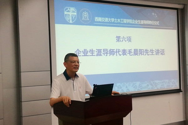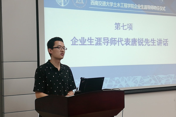随后,企业生涯导师毛晨阳先生和唐锐先生先后作了发言。毛晨阳先生以一个50岁土木本科生就业的案例,讲述了职业选择价值观即职业生涯规划的重要性。唐锐先生在讲话中表达了对母校的感激之情,也非常感谢母校能够提供这样一个交流的平台。土木工程学院学生代表邓宇航进行发言,希望从导师身上了解更多行业背景、增加人生阅历,使土木学子有更多的提升。