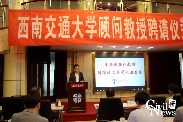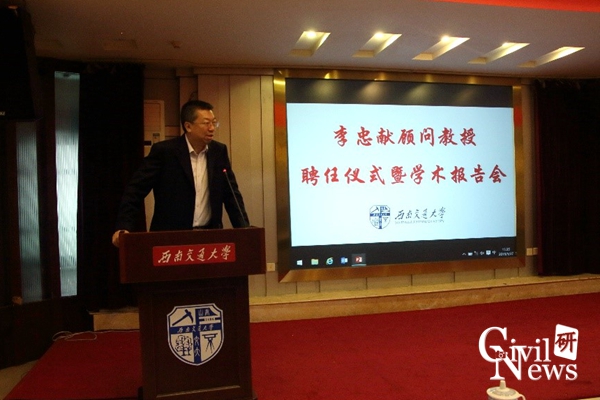 5月27日下午,天津大学教授、天津城建大学校长李忠献受聘为西南交通大学顾问教授仪式暨学术报告会在镜湖宾馆多功能厅举行。聘任仪式由校长助理何川教授主持,学术报告会由我校双聘院士秦顺全教授主持。张文桂副校长出席仪式并为李忠献教授颁发聘书和佩戴西南交通大学校徽。参加仪式的还有中铁大桥院总工高宗余和科技部部长梅大鹏、土木学院院长高波教授、副院长祝兵教授、桥梁系主任李亚东教授、李永乐教授、李小珍教授、赵灿晖教授、占玉林副教授、叶华文副教授、杨万理副教授等,以及100余位土木学院研究生。