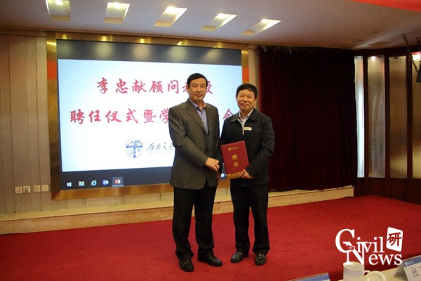 张文桂校长为李忠献教授颁发聘书,佩戴校徽
