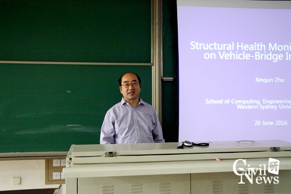 2016年6月20日下午4:00,在我校九里校区逸夫馆X4309教室举办了以“Structural Health Monitoring based on Vehicle-Bridge Interaction”为主题的学术讲座。本次讲座由研究生院主办,土木工程学院承办,主讲人为西悉尼大学结构工程专业朱信群副教授,讲座由我校土木工程学院桥梁工程系李永乐教授主持。出席本次讲座的老师还有土木工程学院副院长祝兵教授、桥梁工程系占玉林、易虹岚、勾红叶、卫星、晋智斌、施州、叶华文、徐腾飞等。本次讲座全面系统地讲解了基于车桥相互作用的结构健康监测特点与优点,旨在增进学术交流,活跃学校的学习氛围。