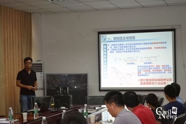 会议上桥梁系博士研究生代表课题组就课题研究内容、实施方案及预期成果等进行了汇报,分别就国内外波浪荷载规定的对比分析、钢管桩的波浪荷载及动力响应分析、施工围堰的波浪荷载及动力响应、桥址区波浪要素预报研究、受地形影响的桥址区场波浪传播数值模拟五方面进行具体阐述,通过该项研究,能够分析出适用于桥梁工程中不同结构物波浪力计算的规范方法,提出一种桥址区波浪要素长、短时预报的方法,成功建立桥址区波浪场的数值模型,对海洋桥梁的设计、施工、维护具有重大意义。