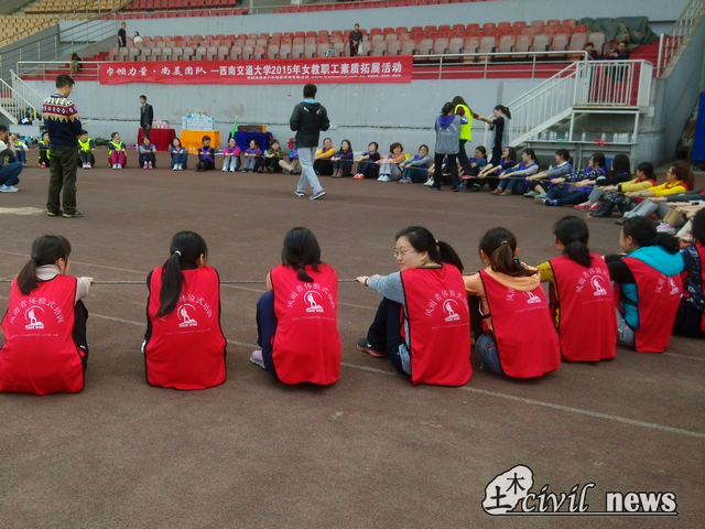 3月13日下午两点,在这个阳光明媚的日子里,由西南交通大学校工会主办,成都风雨者户外拓展运动有限公司承办的“西南交通大学2015年女教职工素质拓展活动”在西南交通大学北区体育场正式举行。本次活动以“巾帼力量,尚美团队”为主题,旨在拓展我校女教职工素质,增强她们的团队协作能力,协同刚刚过去的妇女节给全校女教职工献上最真挚的祝福。