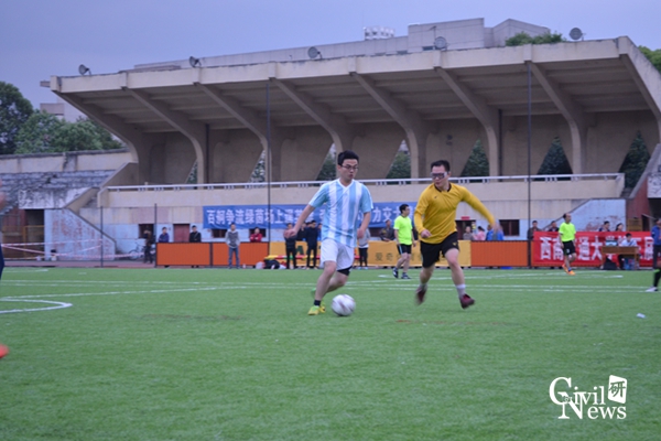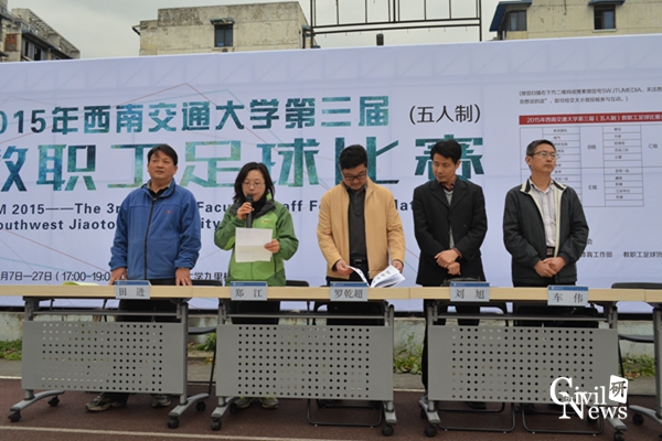 西南交通大学第三届教职工足球赛(五人制)于4月7日至20日在九里校区足球场举行。本次比赛由西南交通大学工会主办,西南交通大学体育工作部和教职工足球协会共同承办,共有来自21个工会的27支队伍参赛。7日下午6点10分开幕式隆重举行,校工会郑江副主席在开幕式上致辞,她从国家和学校层面分别说明了举办教职工足球赛的意义,并预祝比赛取得圆满成功。