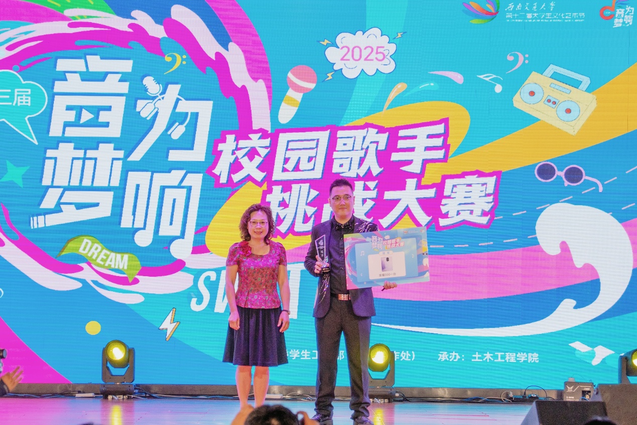 经过激烈的角逐,本届校园歌手挑战大赛冠亚季军最终出炉。土木工程学院党委书记郑江宣读比赛结果:冠军田骐玮、亚军王程安俊及季军何圣麟童;现场观众共同投票评选出最佳人气歌手孟雨萱及最佳人气组合——黄原老师、张雅琪、徐欣战队。嘉宾评委为冠亚季军、最佳拍人气组合、最佳人气奖得主颁奖并合影留念。